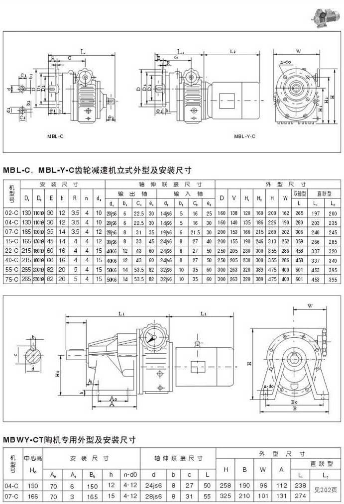MBL-C,MBL-Y=C齒輪減速機的臥式外型及安裝尺寸MBWY-CT陶機專用外型及安裝尺寸
