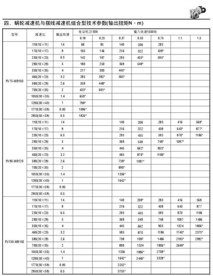 蝸輪減速機(jī)與擺線(xiàn)減速機(jī)組合型技術(shù)參數(shù)表(輸出扭矩N.M)二