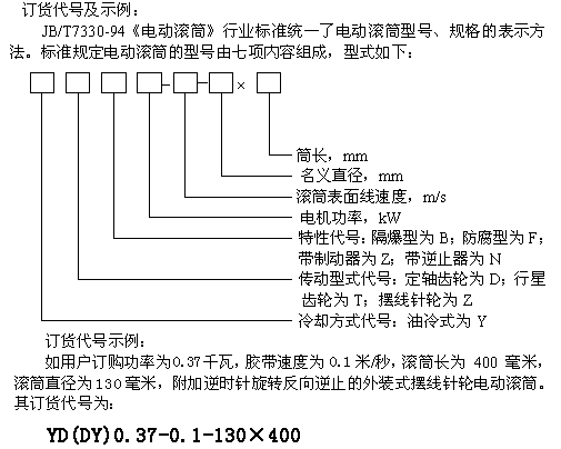 (2)用戶訂購逆止電動滾筒時,須注明旋轉(zhuǎn)方向,如不注明則為任意方向。其表示方法為在特性代號后加“S”(表示在電機引出線一側(cè)觀察,端蓋應(yīng)順時針旋轉(zhuǎn))或“N”(表示在電機引出線一側(cè)觀察,端蓋應(yīng)逆時針旋轉(zhuǎn))。